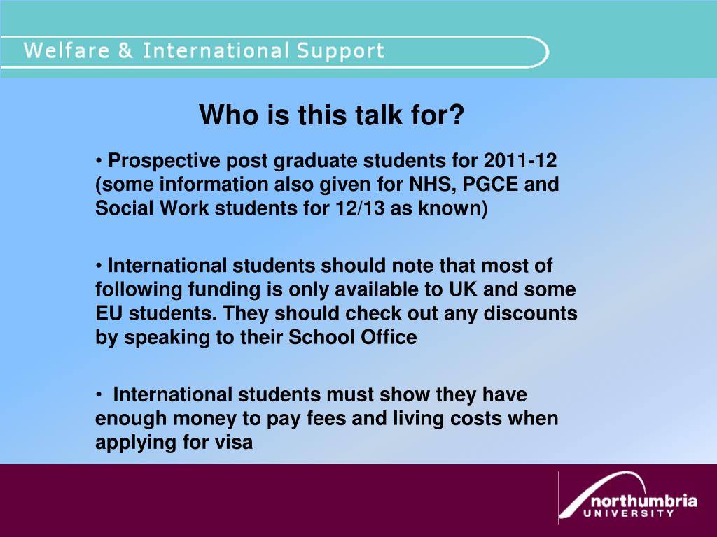 Disability Support Who is this talk for? Prospective post graduate students for 2011-12 (some information also given for NHS, PGCE and Social Work students for 12/13 as known) International students should note that most of following funding is only available to UK and some EU students. They should check out any discounts by speaking to their School Office International students must show they have enough money to pay fees and living costs when applying for visa