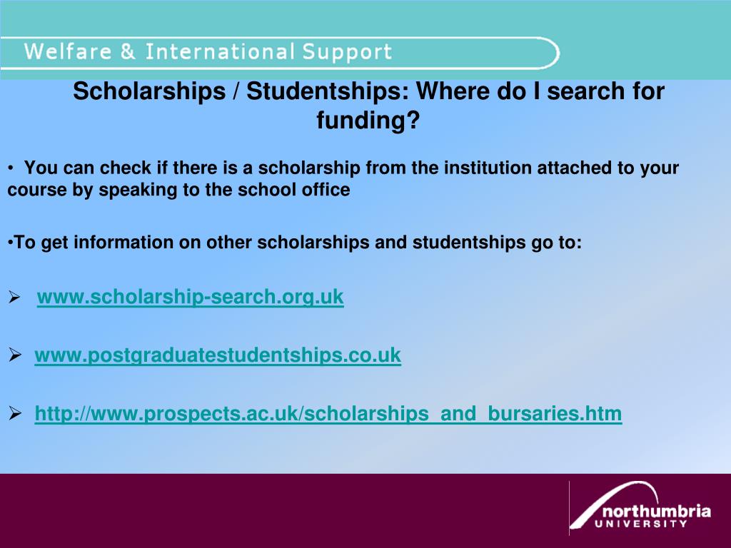 Disability Support Scholarships / Studentships: Where do I search for funding? You can check if there is a scholarship from the institution attached to your course by speaking to the school office To get information on other scholarships and studentships go to: www.scholarship-search.org.uk www.postgraduatestudentships.co.uk http://www.prospects.ac.uk/scholarships_and_bursaries.htm