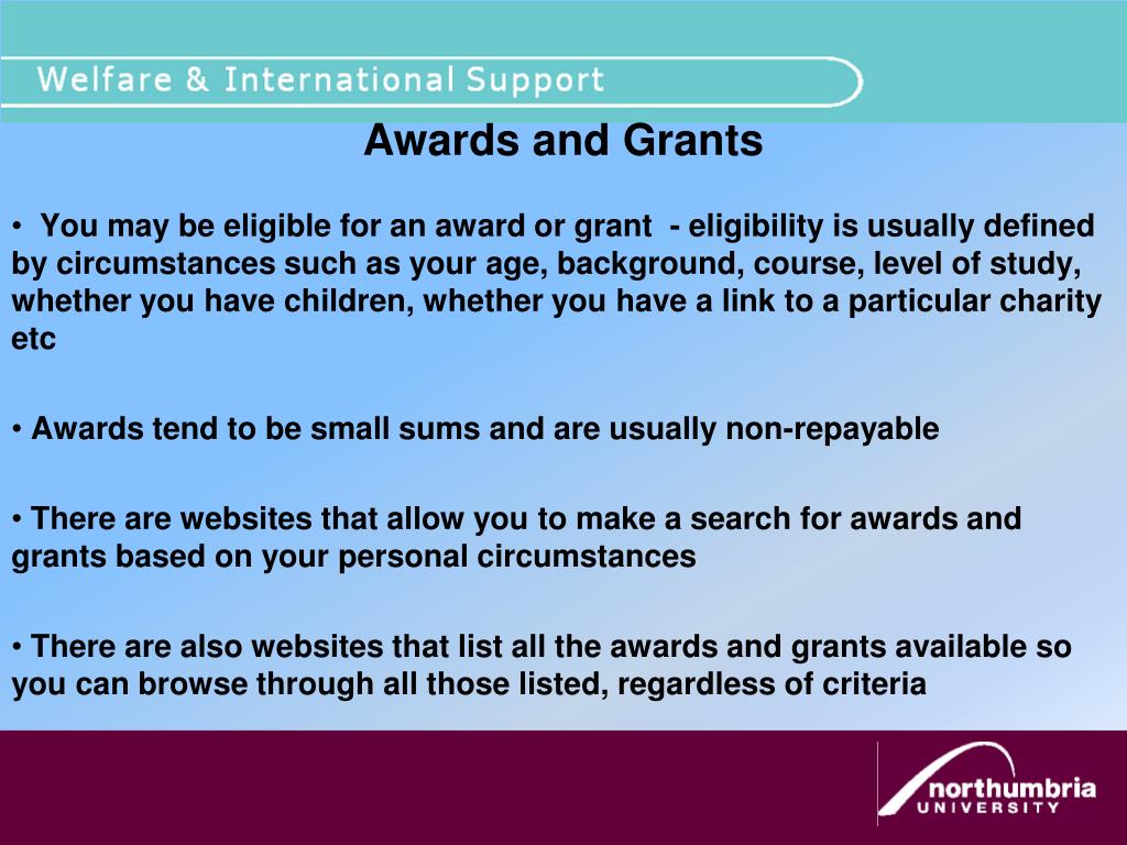 Disability Support Awards and Grants You may be eligible for an award or grant - eligibility is usually defined by circumstances such as your age, background, course, level of study, whether you have children, whether you have a link to a particular charity etc Awards tend to be small sums and are usually non-repayable There are websites that allow you to make a search for awards and grants based on your personal circumstances There are also websites that list all the awards and grants available so you can browse through all those listed, regardless of criteria