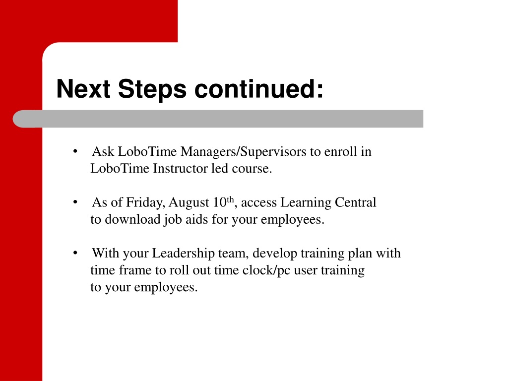Next Steps continued: • Ask LoboTime Managers/Supervisors to enroll in • LoboTime Instructor led course. • As of Friday, August 10th, access Learning Central • to download job aids for your employees. • With your Leadership team, develop training plan with • time frame to roll out time clock/pc user training • to your employees.