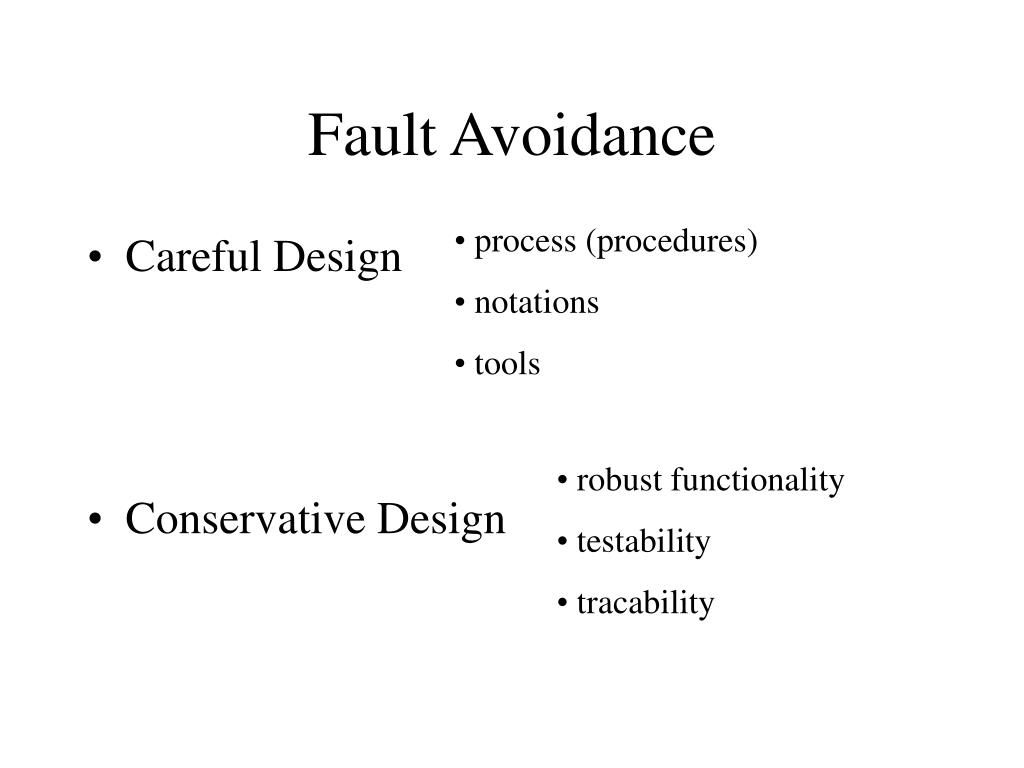 Fault Avoidance • process (procedures) • notations • tools • Careful Design • Conservative Design • robust functionality • testability • tracability
