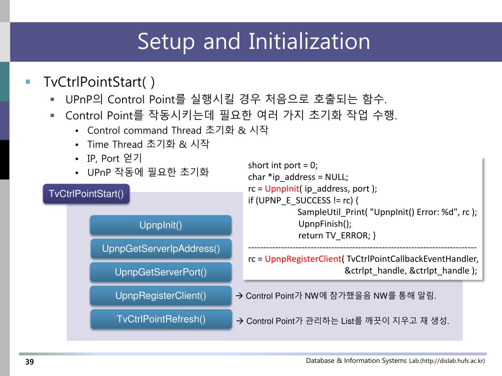 Setup and Initialization • TvCtrlPointStart( ) • UPnP의 Control Point를 실행시킬 경우 처음으로 호출되는 함수. • Control Point를 작동시키는데 필요한 여러 가지 초기화 작업 수행. • Control command Thread 초기화 & 시작 • Time Thread 초기화 & 시작 • IP, Port 얻기 • UPnP 작동에 필요한 초기화 short int port = 0; char *ip_address = NULL; rc = UpnpInit( ip_address, port ); if (UPNP_E_SUCCESS != rc) { SampleUtil_Print( "UpnpInit() Error: %d", rc ); UpnpFinish(); return TV_ERROR; } ----------------------------------------------------------------------------- rc = UpnpRegisterClient( TvCtrlPointCallbackEventHandler, &ctrlpt_handle, &ctrlpt_handle); TvCtrlPointStart() UpnpInit() UpnpGetServerIpAddress() UpnpGetServerPort() UpnpRegisterClient() Control Point가 NW에 참가했을음 NW를 통해 알림. TvCtrlPointRefresh() Control Point가 관리하는 List를 깨끗이 지우고 재 생성. Database & Information Systems Lab.(http://dislab.hufs.ac.kr)