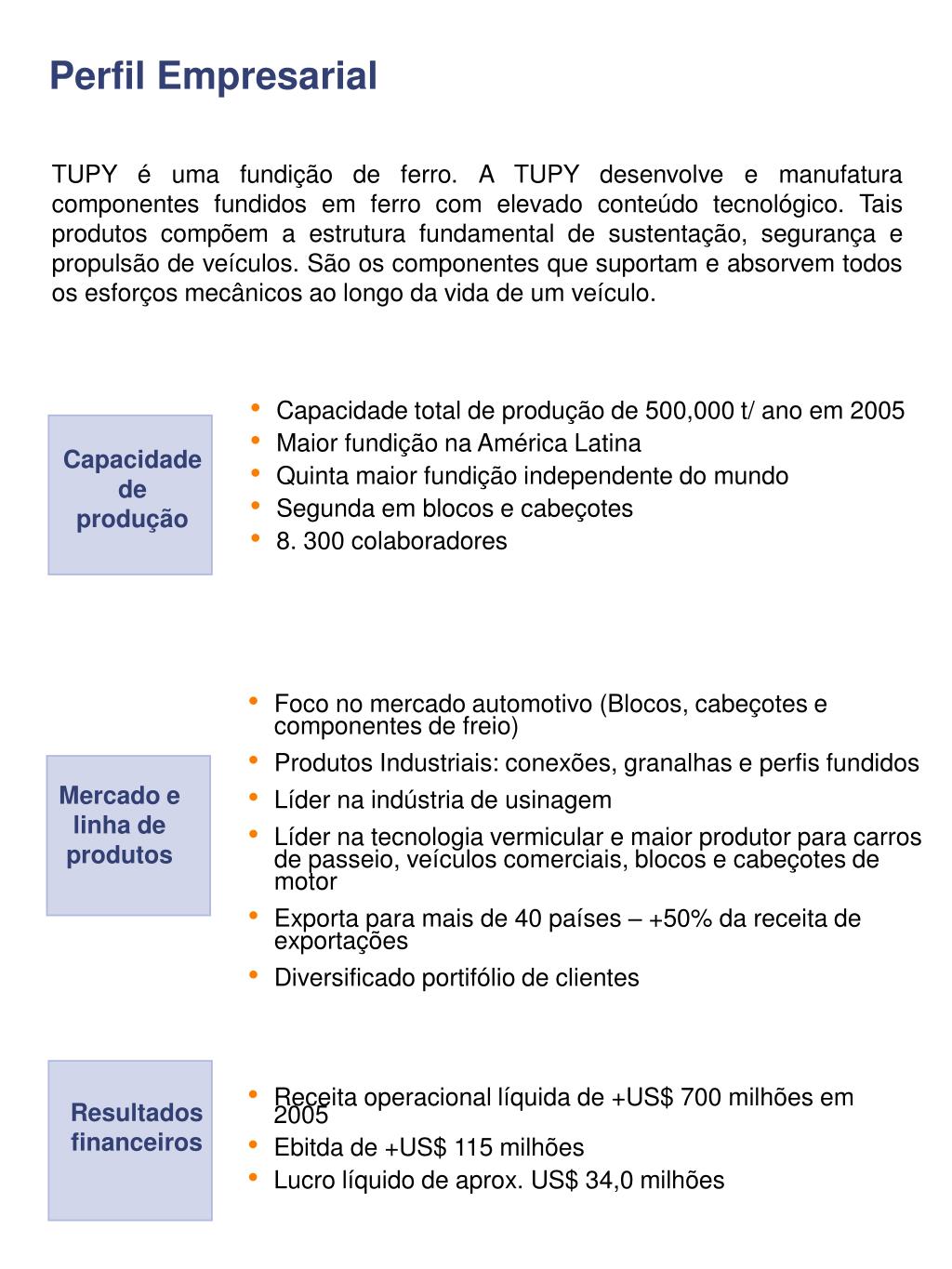 Perfil Empresarial TUPY é uma fundição de ferro. A TUPY desenvolve e manufatura componentes fundidos em ferro com elevado conteúdo tecnológico. Tais produtos compõem a estrutura fundamental de sustentação, segurança e propulsão de veículos. São os componentes que suportam e absorvem todos os esforços mecânicos ao longo da vida de um veículo. • Capacidade total de produção de 500,000 t/ ano em 2005 • Maior fundição na América Latina • Quinta maior fundição independente do mundo • Segunda em blocos e cabeçotes • 8. 300 colaboradores Capacidade de produção • Foco no mercado automotivo (Blocos, cabeçotes e componentes de freio) • Produtos Industriais: conexões, granalhas e perfis fundidos • Líder na indústria de usinagem • Líder na tecnologia vermicular e maior produtor para carros de passeio, veículos comerciais, blocos e cabeçotes de motor • Exporta para mais de 40 países – +50% da receita de exportações • Diversificado portifólio de clientes Mercado e linha de produtos • Receita operacional líquida de +US$ 700 milhões em 2005 • Ebitda de +US$ 115 milhões • Lucro líquido de aprox. US$ 34,0 milhões Resultados financeiros