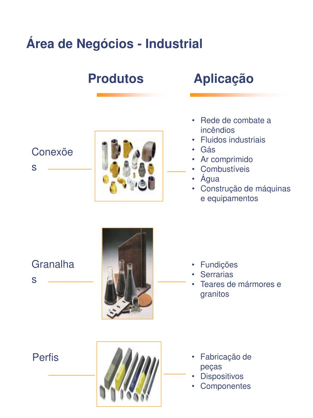 Área de Negócios - Industrial Produtos Aplicação • Rede de combate a incêndios • Fluidos industriais • Gás • Ar comprimido • Combustíveis • Água • Construção de máquinase equipamentos Conexões Granalhas • Fundições • Serrarias • Teares de mármores e granitos Perfis • Fabricação de peças • Dispositivos • Componentes