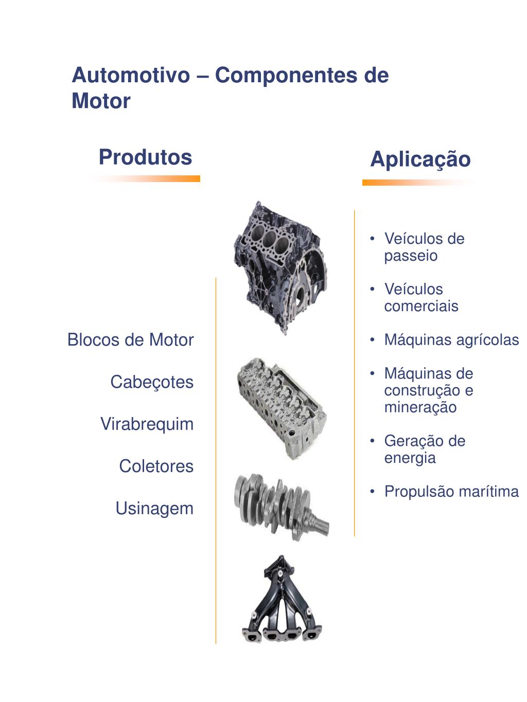 Automotivo – Componentes de Motor Produtos Aplicação • Veículos de passeio • Veículos comerciais • Máquinas agrícolas • Máquinas de construção e mineração • Geração de energia • Propulsão marítima Blocos de Motor Cabeçotes Virabrequim Coletores Usinagem