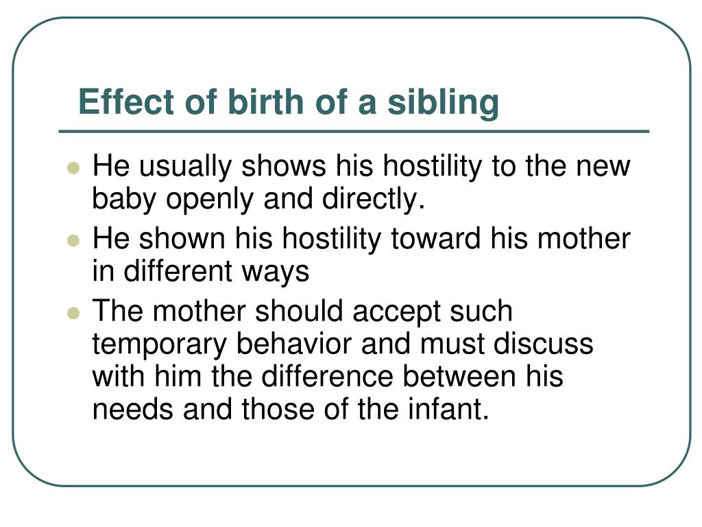 Effect of birth of a sibling • He usually shows his hostility to the new baby openly and directly. • He shown his hostility toward his mother in different ways • The mother should accept such temporary behavior and must discuss with him the difference between his needs and those of the infant.