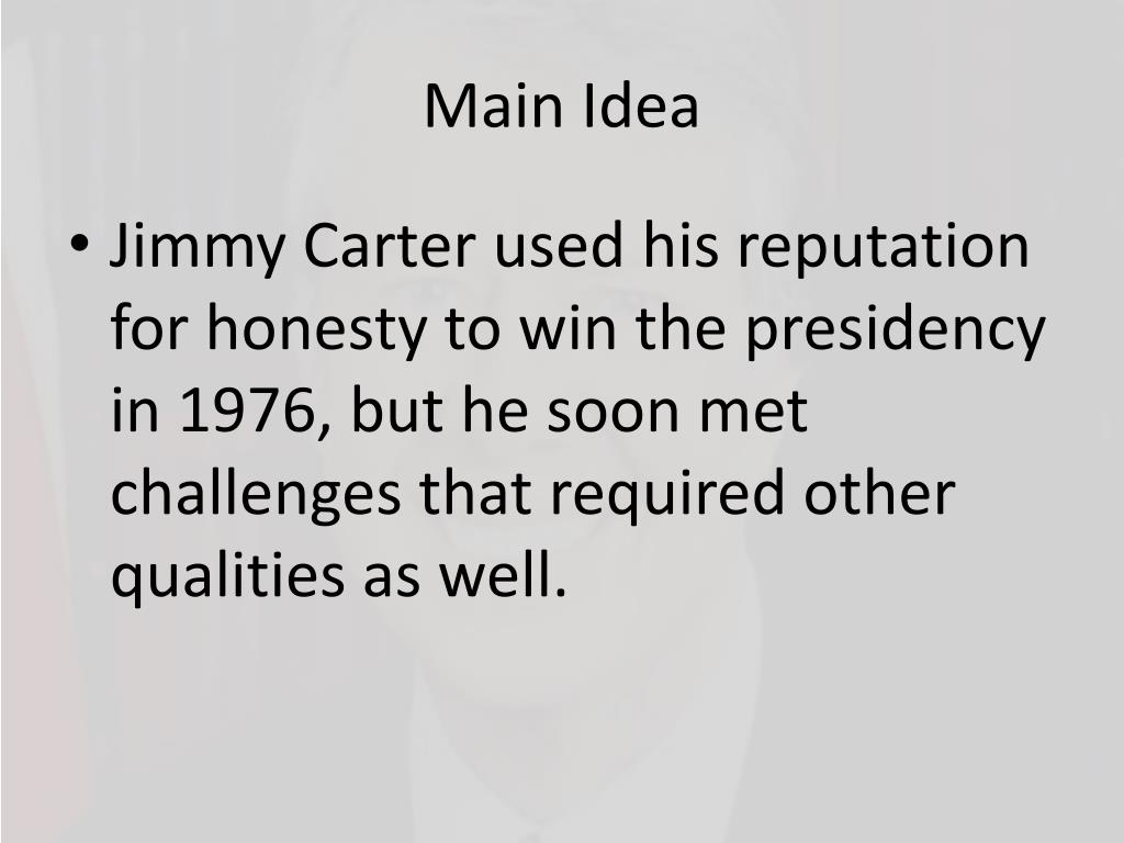 Main Idea • Jimmy Carter used his reputation for honesty to win the presidency in 1976, but he soon met challenges that required other qualities as well.
