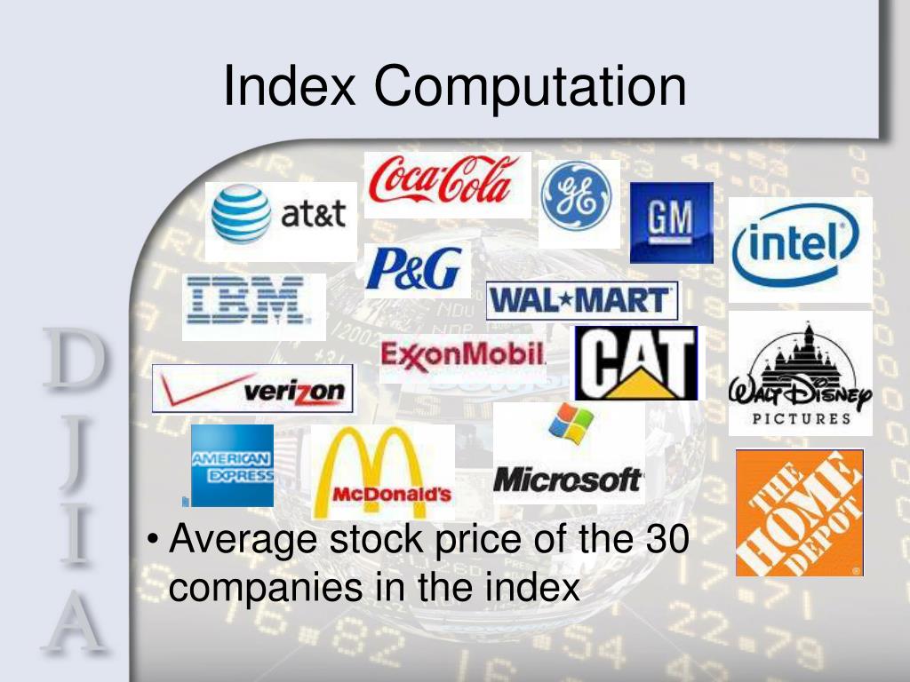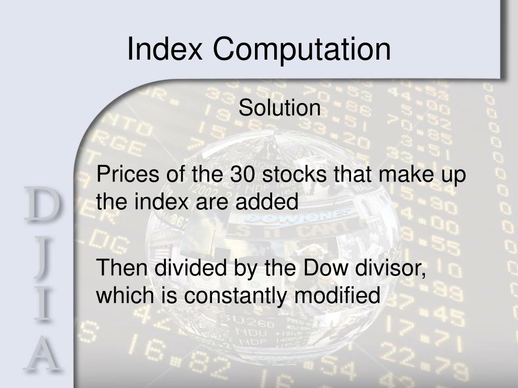 Index Computation Solution Prices of the 30 stocks that make up the index are added Then divided by the Dow divisor, which is constantly modified