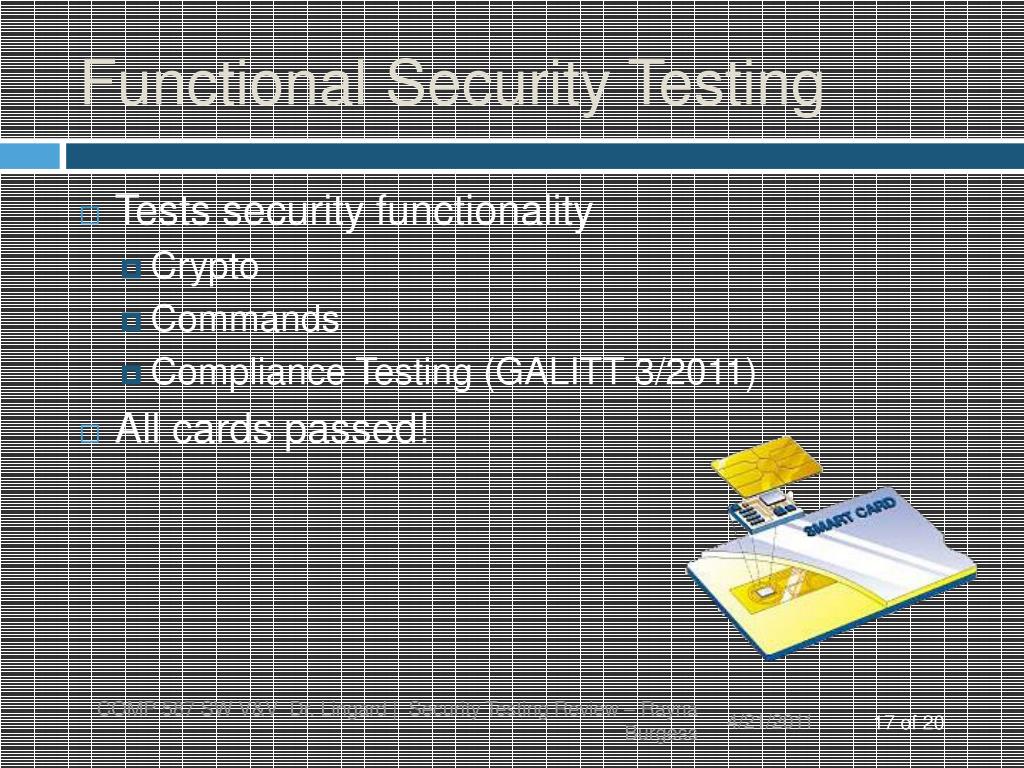 Functional Security Testing COMP 587 SW V&V Dr. Lingard | Security Testing Review – Rayna Burgess • Tests security functionality • Crypto • Commands • Compliance Testing (GALITT 3/2011) • All cards passed!