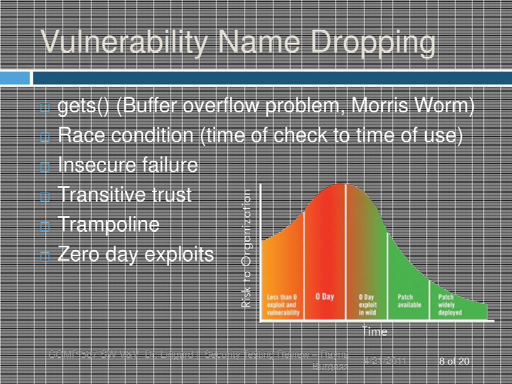 Vulnerability Name Dropping COMP 587 SW V&V Dr. Lingard | Security Testing Review – Rayna Burgess gets() (Buffer overflow problem, Morris Worm) Race condition (time of check to time of use) Insecure failure Transitive trust Trampoline Zero day exploits