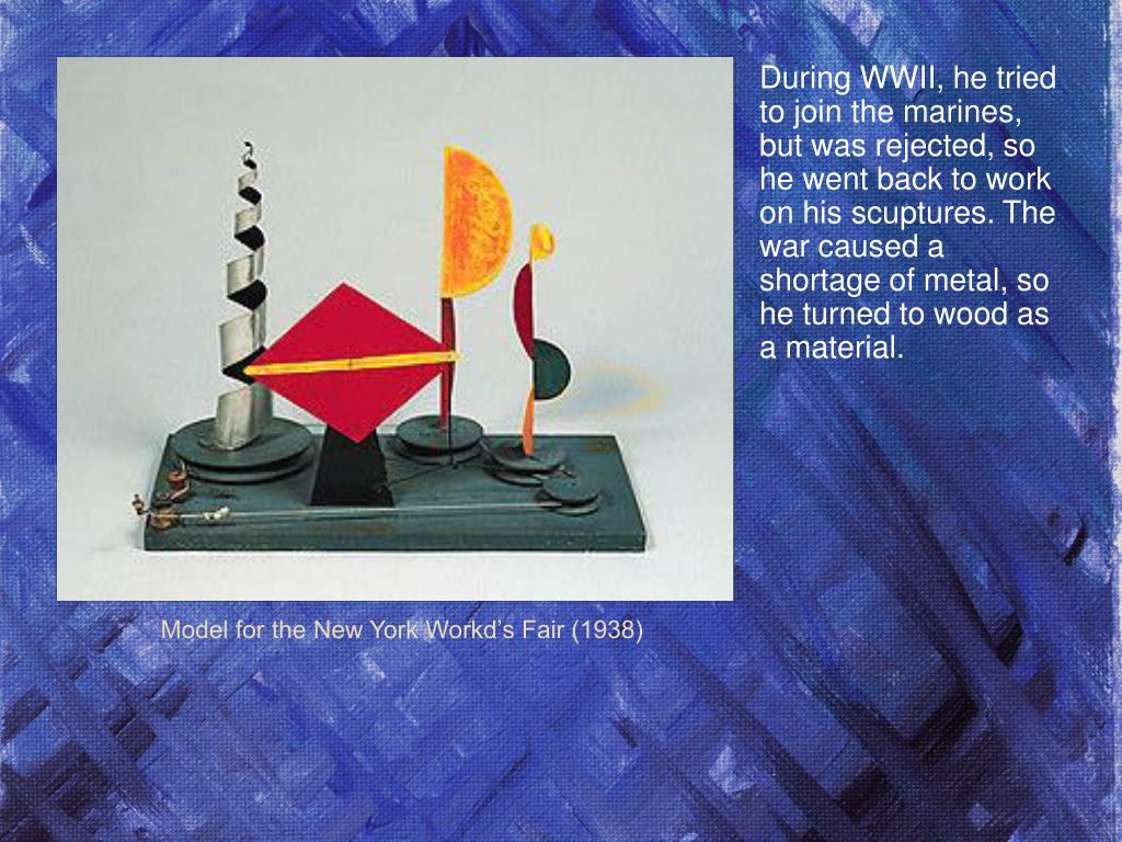 During WWII, he tried to join the marines, but was rejected, so he went back to work on his scuptures. The war caused a shortage of metal, so he turned to wood as a material. Model for the New York Workd’s Fair (1938)