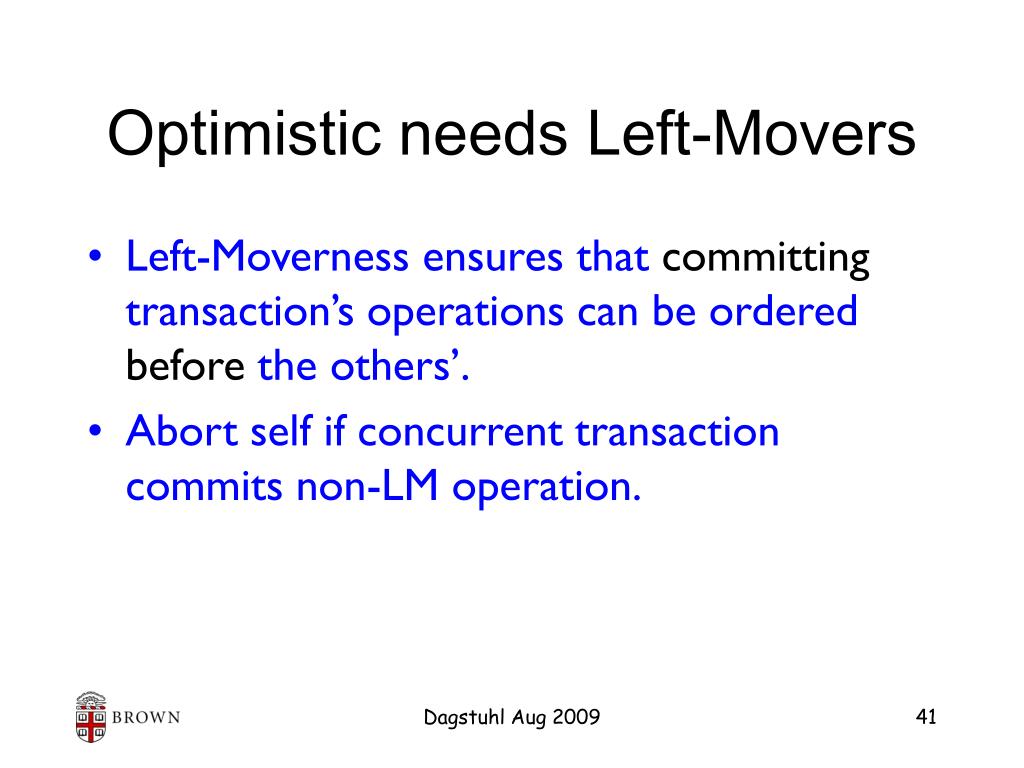Optimistic needs Left-Movers • Left-Moverness ensures that committing transaction’s operations can be ordered before the others’. • Abort self if concurrent transaction commits non-LM operation. Dagstuhl Aug 2009