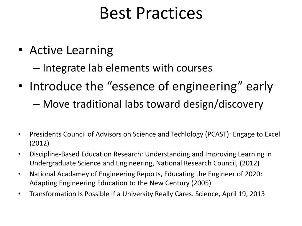 Best Practices • Active Learning • Integrate lab elements with courses • Introduce the “essence of engineering” early • Move traditional labs toward design/discovery • Presidents Council of Advisors on Science and Techlology (PCAST): Engage to Excel (2012) • Discipline-Based Education Research: Understanding and Improving Learning in Undergraduate Science and Engineering, National Research Council, (2012) • National Acadamey of Engineering Reports, Educating the Engineer of 2020: Adapting Engineering Education to the New Century (2005) • Transformation Is Possible If a University Really Cares. Science, April 19, 2013