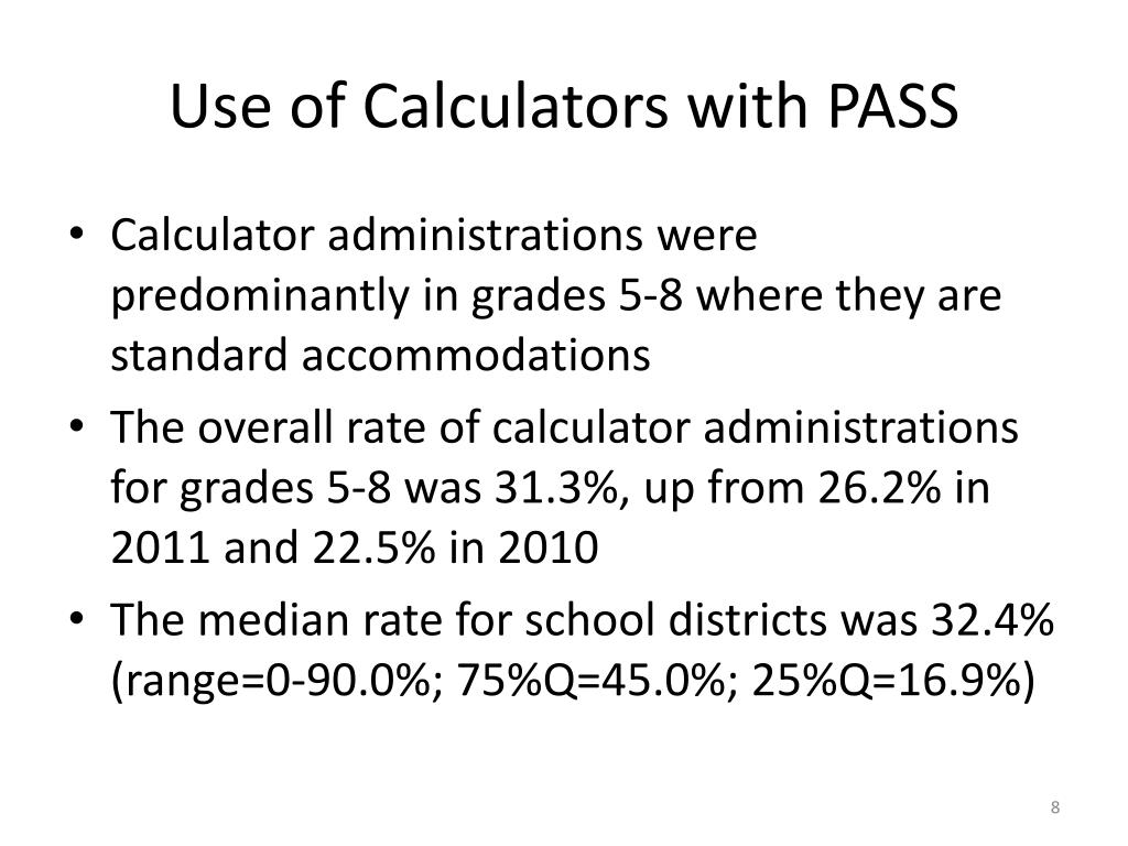 Use of Calculators with PASS • Calculator administrations were predominantly in grades 5-8 where they are standard accommodations • The overall rate of calculator administrations for grades 5-8 was 31.3%, up from 26.2% in 2011 and 22.5% in 2010 • The median rate for school districts was 32.4% (range=0-90.0%; 75%Q=45.0%; 25%Q=16.9%)