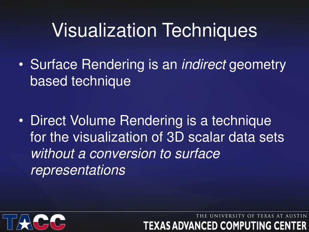 Visualization Techniques Surface Rendering is an indirect geometry based technique Direct Volume Rendering is a technique for the visualization of 3D scalar data sets without a conversion to surface representations