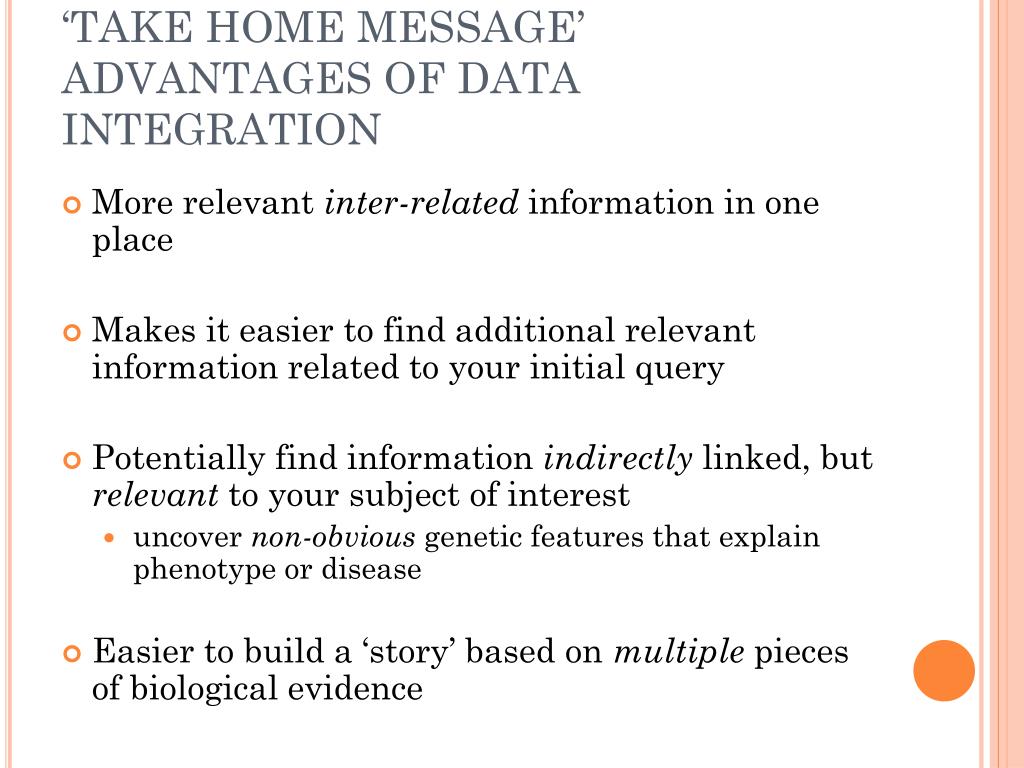 ‘TAKE HOME MESSAGE’ ADVANTAGES OF DATA INTEGRATION • More relevant inter-related information in one place • Makes it easier to find additional relevant information related to your initial query • Potentially find information indirectly linked, but relevant to your subject of interest • uncover non-obvious genetic features that explain phenotype or disease • Easier to build a ‘story’ based on multiple pieces of biological evidence