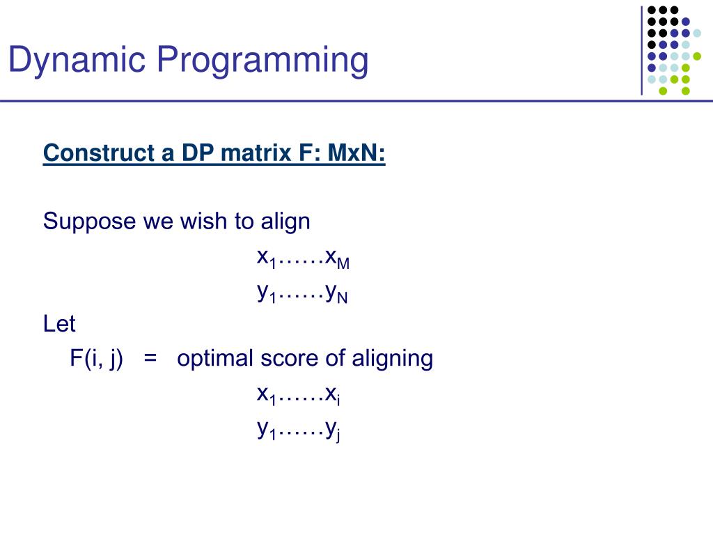 Dynamic Programming Construct a DP matrix F: MxN: Suppose we wish to align x1……xM y1……yN Let F(i, j) = optimal score of aligning x1……xi y1……yj