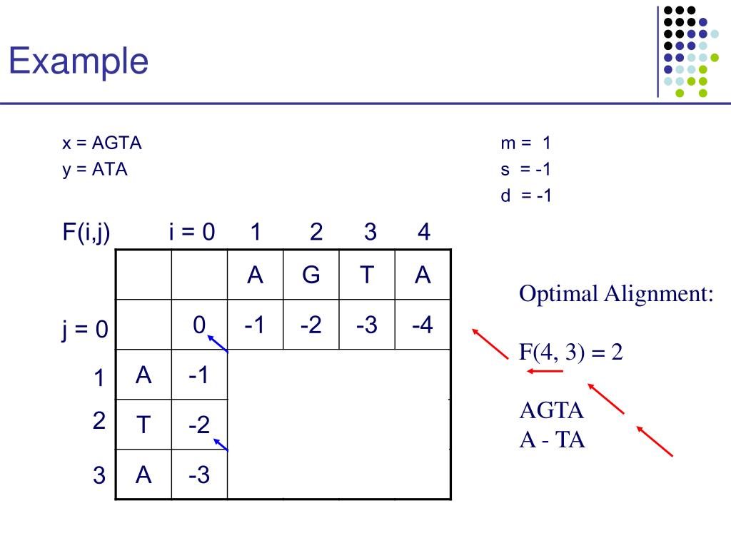 Example x = AGTA m = 1 y = ATA s = -1 d = -1 F(i,j) i = 0 1 2 3 4 Optimal Alignment: F(4, 3) = 2 AGTA A - TA j = 0 1 2 3