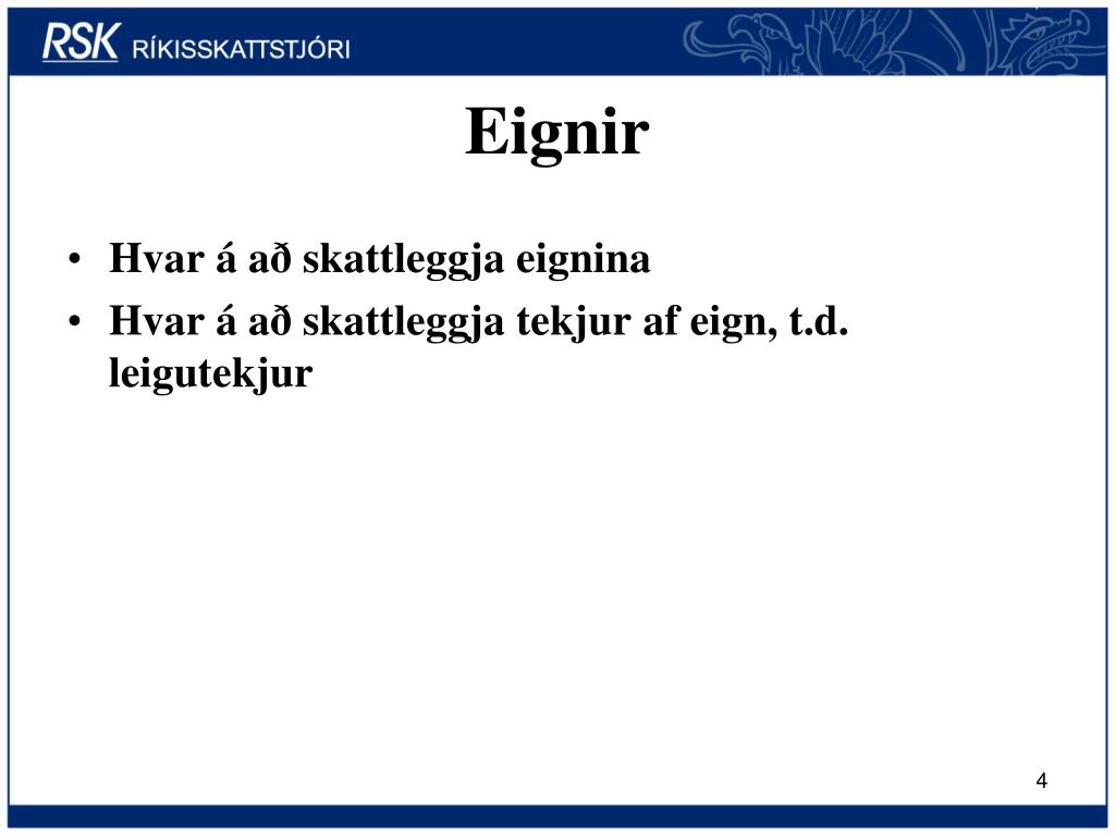 Eignir • Hvar á að skattleggja eignina • Hvar á að skattleggja tekjur af eign, t.d. leigutekjur