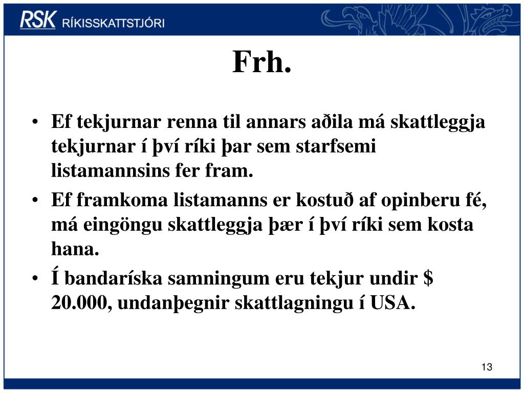 Frh. • Ef tekjurnar renna til annars aðila má skattleggja tekjurnar í því ríki þar sem starfsemi listamannsins fer fram. • Ef framkoma listamanns er kostuð af opinberu fé, má eingöngu skattleggja þær í því ríki sem kosta hana. • Í bandaríska samningum eru tekjur undir $ 20.000, undanþegnir skattlagningu í USA.