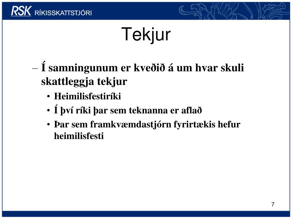 Tekjur • Í samningunum er kveðið á um hvar skuli skattleggja tekjur • Heimilisfestiríki • Í því ríki þar sem teknanna er aflað • Þar sem framkvæmdastjórn fyrirtækis hefur heimilisfesti