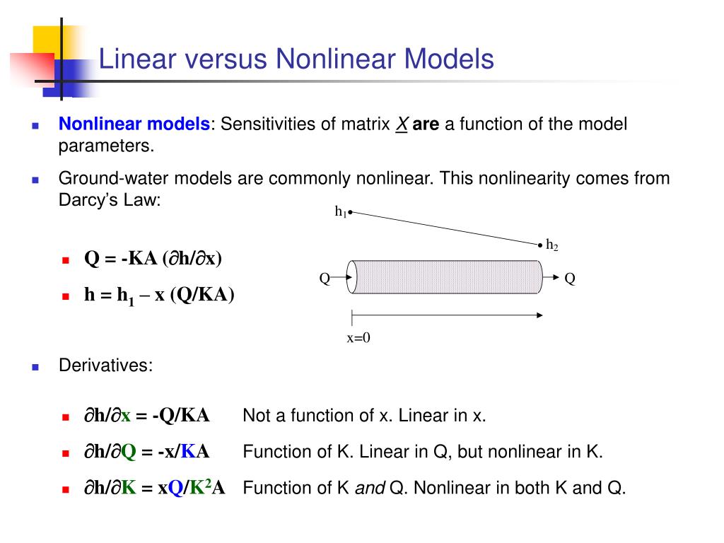 Linear versus Nonlinear Models • Nonlinear models: Sensitivities of matrix Xare a function of the model parameters. • Ground-water models are commonly nonlinear. This nonlinearity comes from Darcy’s Law: • Q = -KA (h/x) • h = h1 – x (Q/KA) • Derivatives: • h/x = -Q/KA Not a function of x. Linear in x. • h/Q = -x/KA Function of K. Linear in Q, but nonlinear in K. • h/K = xQ/K2A Function of K and Q. Nonlinear in both K and Q.