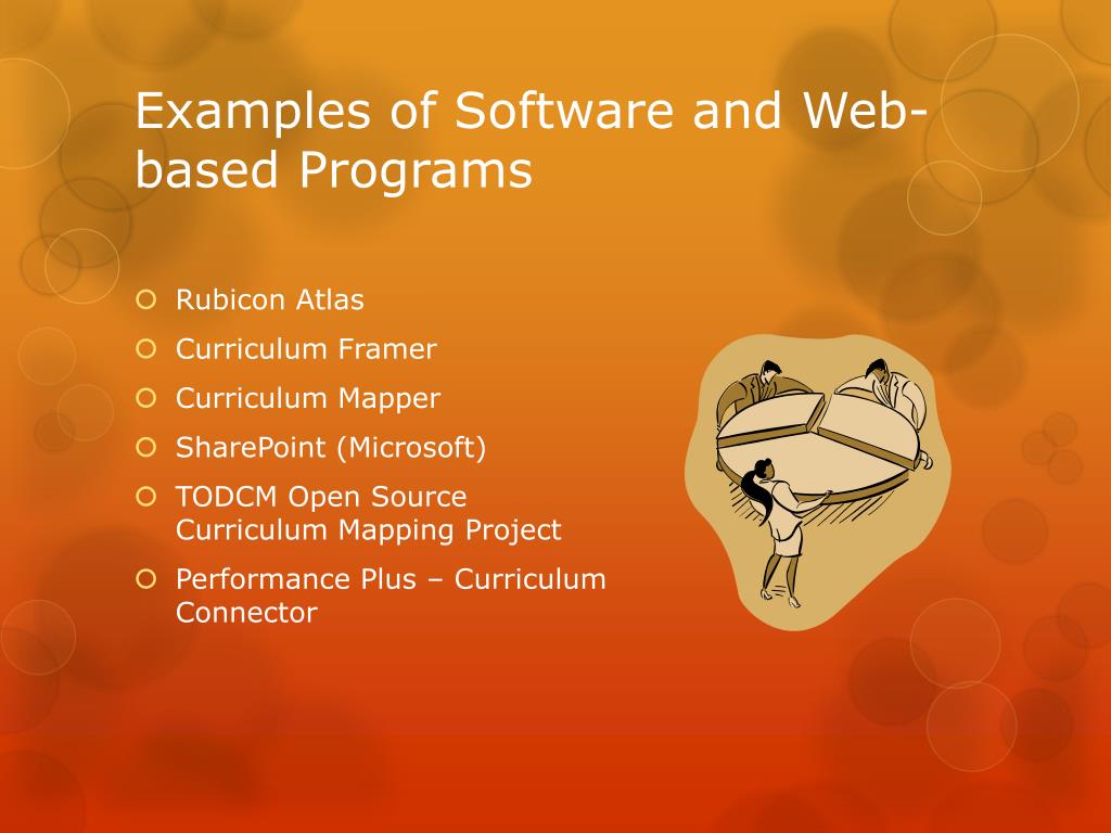 Examples of Software and Web-based Programs • Rubicon Atlas • Curriculum Framer • Curriculum Mapper • SharePoint (Microsoft) • TODCM Open Source Curriculum Mapping Project • Performance Plus – Curriculum Connector