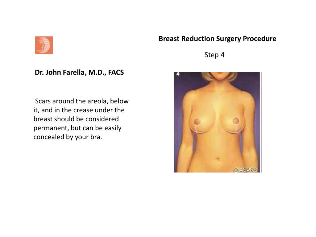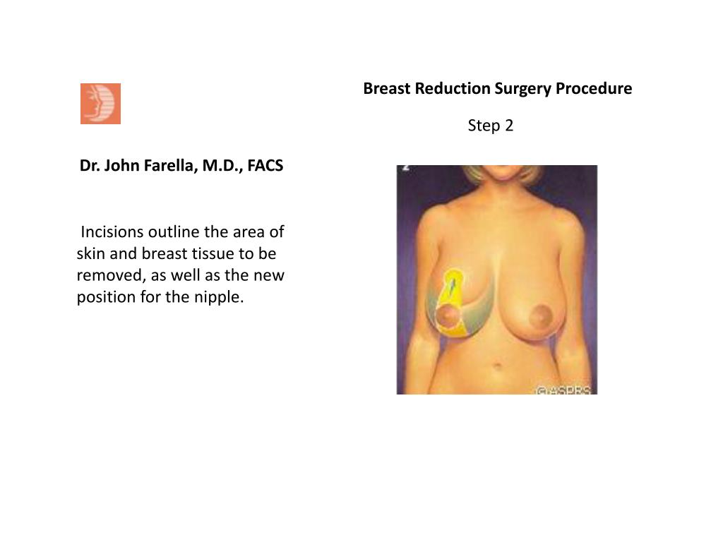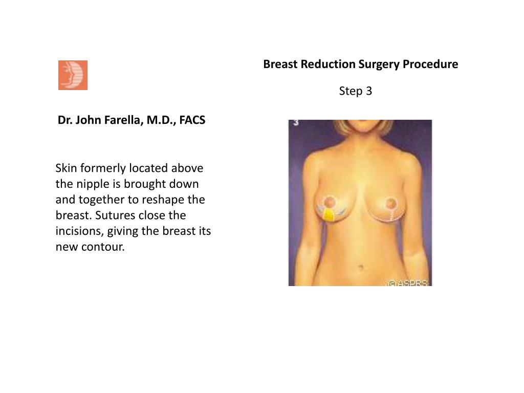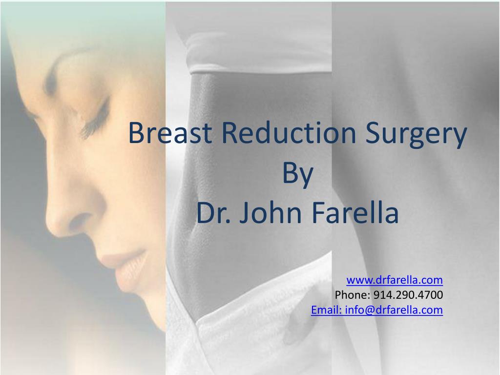 Breast Reduction Surgery By Dr . John Farella. Large , heavy breasts can lead to neck, back, and shoulder pain. Heavy breasts can also lead to shoulder indentations, and extreme self-consciousness . . Step 1.