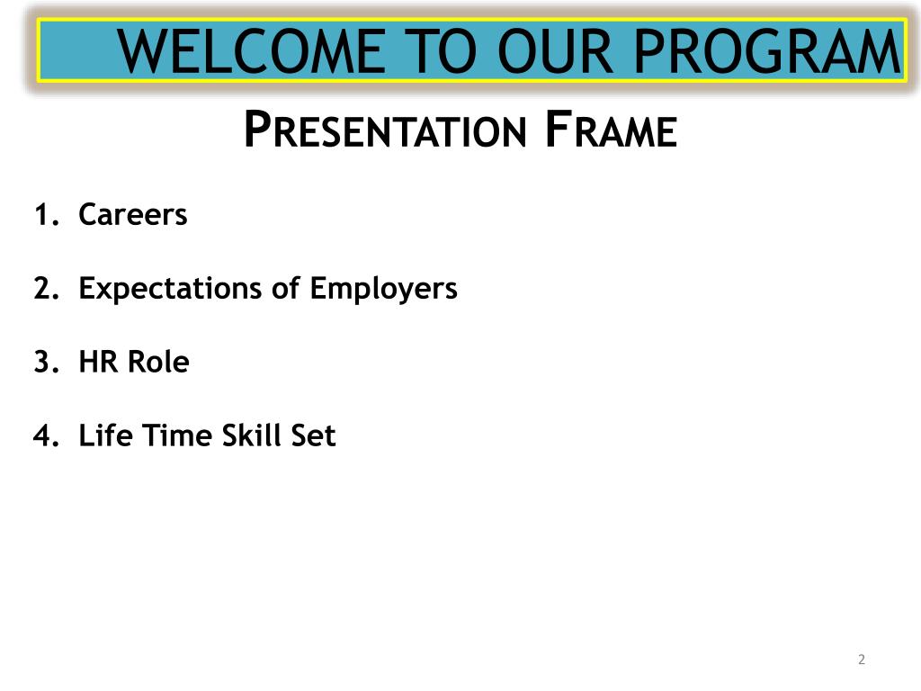 WELCOME TO OUR PROGRAM Presentation Frame Careers Expectations of Employers HR Role Life Time Skill Set