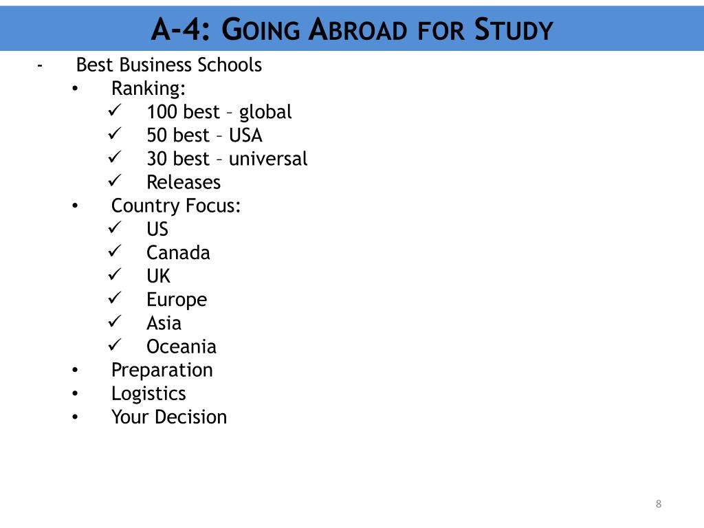 A-4: Going Abroad for Study • Best Business Schools • Ranking: • 100 best – global • 50 best – USA • 30 best – universal • Releases • Country Focus: • US • Canada • UK • Europe • Asia • Oceania • Preparation • Logistics • Your Decision