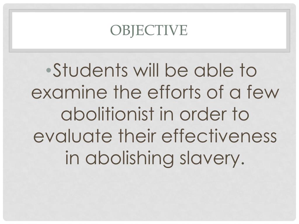 Objective • Students will be able to examine the efforts of a few abolitionist in order to evaluate their effectiveness in abolishing slavery.
