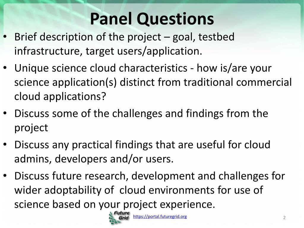 Panel Questions • Brief description of the project – goal, testbed infrastructure, target users/application. • Unique science cloud characteristics - how is/are your science application(s) distinct from traditional commercial cloud applications? • Discuss some of the challenges and findings from the project • Discuss any practical findings that are useful for cloud admins, developers and/or users. • Discuss future research, development and challenges for wider adoptability of cloud environments for use of science based on your project experience.