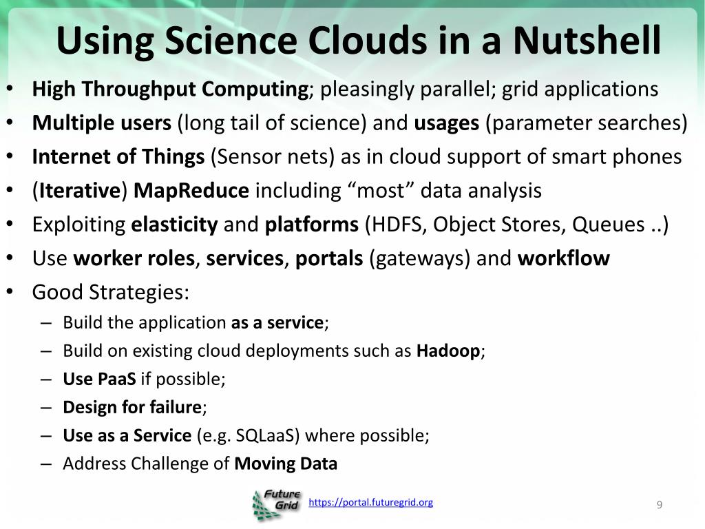 Using Science Clouds in a Nutshell • High Throughput Computing; pleasingly parallel; grid applications • Multiple users (long tail of science) and usages (parameter searches) • Internet of Things (Sensor nets) as in cloud support of smart phones • (Iterative) MapReduce including “most” data analysis • Exploiting elasticity and platforms (HDFS, Object Stores, Queues ..) • Use worker roles, services, portals (gateways) and workflow • Good Strategies: • Build the application as a service; • Build on existing cloud deployments such as Hadoop; • Use PaaSif possible; • Design for failure; • Use as a Service (e.g. SQLaaS) where possible; • Address Challenge of Moving Data