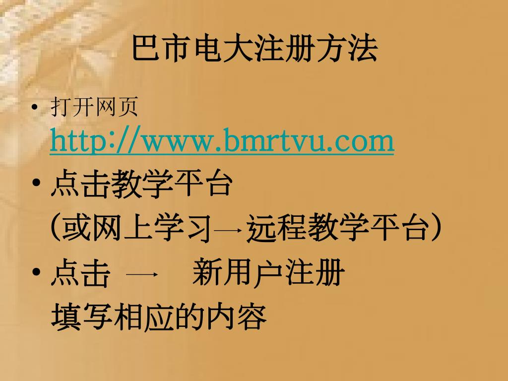 巴市电大注册方法 • 打开网页http://www.bmrtvu.com • 点击教学平台 (或网上学习 远程教学平台) • 点击 新用户注册 填写相应的内容