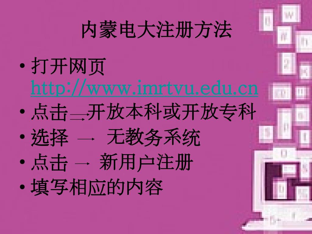 内蒙电大注册方法 • 打开网页http://www.imrtvu.edu.cn • 点击 开放本科或开放专科 • 选择 无教务系统 • 点击 新用户注册 • 填写相应的内容