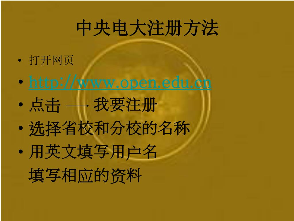 中央电大注册方法 • 打开网页 • http://www.open.edu.cn • 点击 我要注册 • 选择省校和分校的名称 • 用英文填写用户名 填写相应的资料