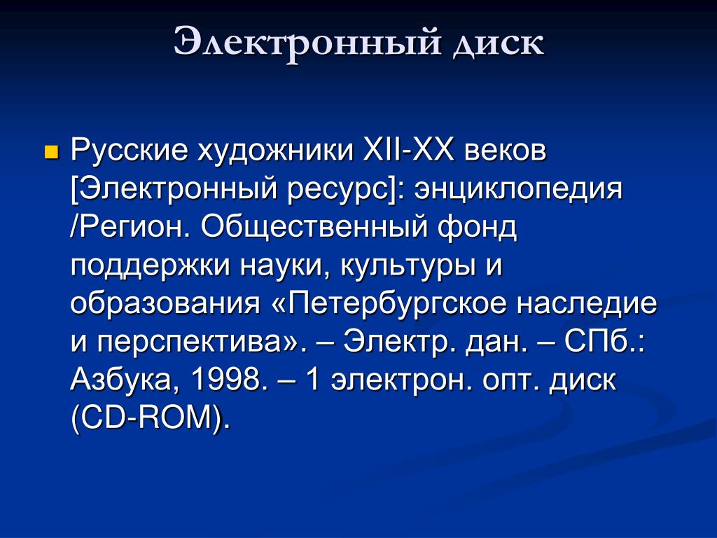 Электронный диск Русские художники XII-XX веков [Электронный ресурс]: энциклопедия /Регион. Общественный фонд поддержки науки, культуры и образования «Петербургское наследие и перспектива». – Электр. дан. – СПб.: Азбука, 1998. – 1 электрон. опт. диск (CD-ROM).