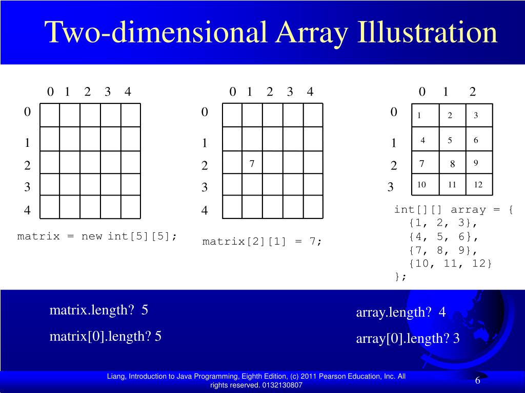 Objectives • To give examples of representing data using two-dimensional arrays (§7.1). • To declare variables for two-dimensional arrays, create arrays, and access array elements in a two-dimensional array using row and column indexes (§7.2). • To program common operations for two-dimensional arrays (displaying arrays, summing all elements, finding min and max elements, and random shuffling) (§7.3). • To pass two-dimensional arrays to methods (§7.4). • To write a program for grading multiple-choice questions using two-dimensional arrays (§7.5). • To solve the closest-pair problem using two-dimensional arrays (§7.6). • To check a Sudoku solution using two-dimensional arrays (§7.7). • To use multidimensional arrays (§7.8).