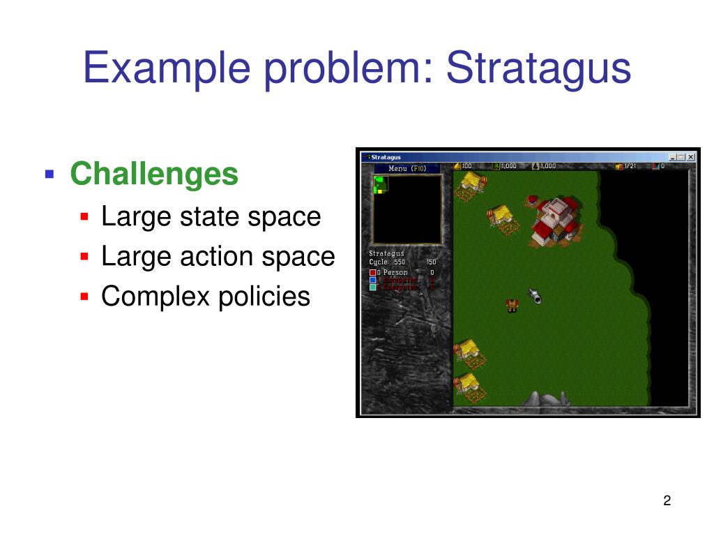 Example problem: Stratagus • Challenges • Large state space • Large action space • Complex policies