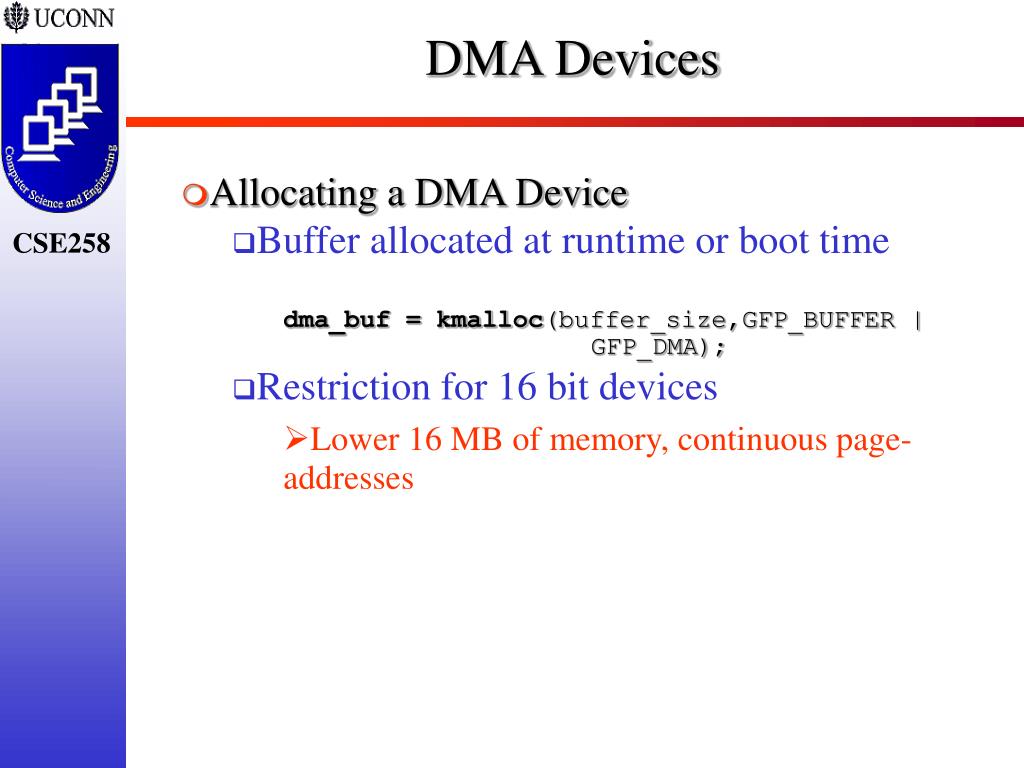 DMA Devices • Allocating a DMA Device • Buffer allocated at runtime or boot time dma_buf = kmalloc(buffer_size,GFP_BUFFER | GFP_DMA); • Restriction for 16 bit devices • Lower 16 MB of memory, continuous page-addresses