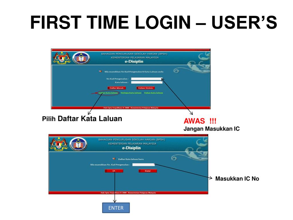 FIRST TIME LOGIN – USER’S Pilih Daftar Kata Laluan AWAS !!! Jangan Masukkan IC Masukkan IC No ENTER