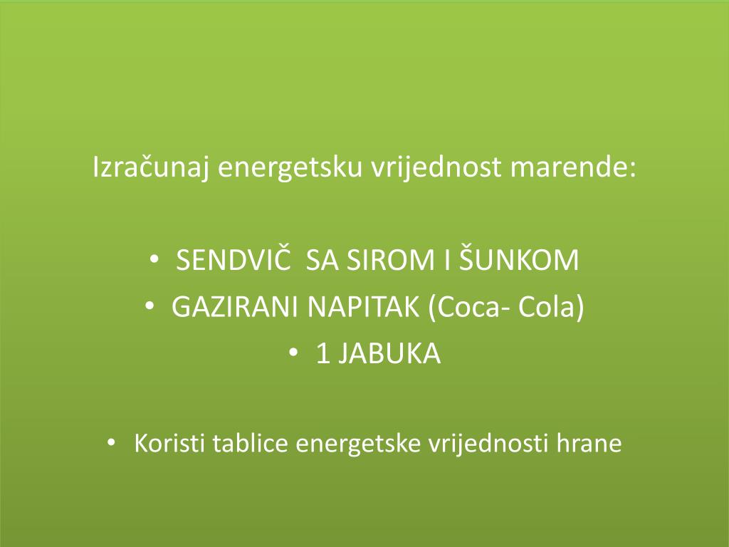 Izračunaj energetsku vrijednost marende: • SENDVIČ SA SIROM I ŠUNKOM • GAZIRANI NAPITAK (Coca- Cola) • 1 JABUKA • Koristi tablice energetske vrijednosti hrane