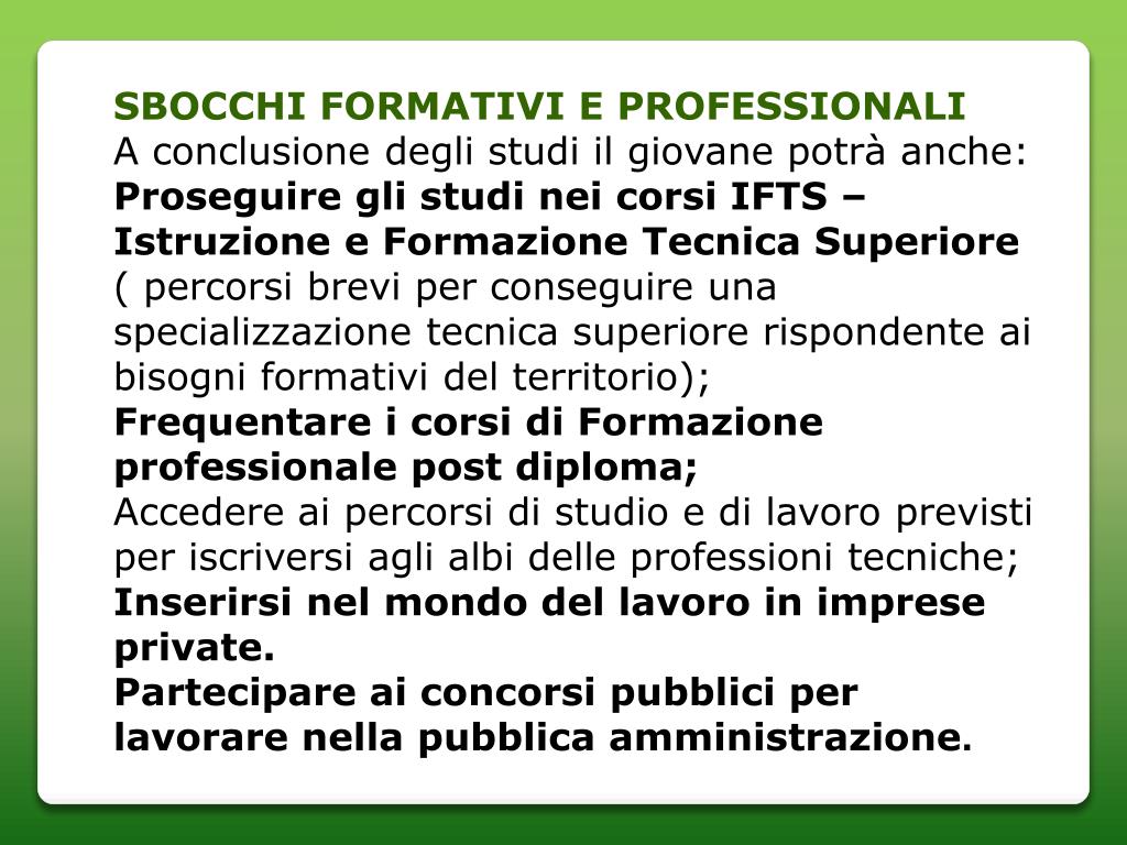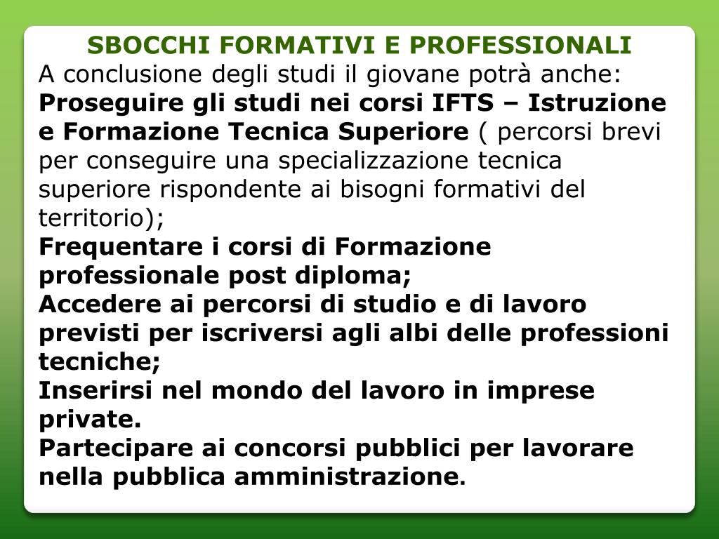 SBOCCHI FORMATIVI E PROFESSIONALI A conclusione degli studi il giovane potrà anche: Proseguire gli studi nei corsi IFTS – Istruzione e Formazione Tecnica Superiore ( percorsi brevi per conseguire una specializzazione tecnica superiore rispondente ai bisogni formativi del territorio); Frequentare i corsi di Formazione professionale post diploma; Accedere ai percorsi di studio e di lavoro previsti per iscriversi agli albi delle professioni tecniche; Inserirsi nel mondo del lavoro in imprese private. Partecipare ai concorsi pubblici per lavorare nella pubblica amministrazione.