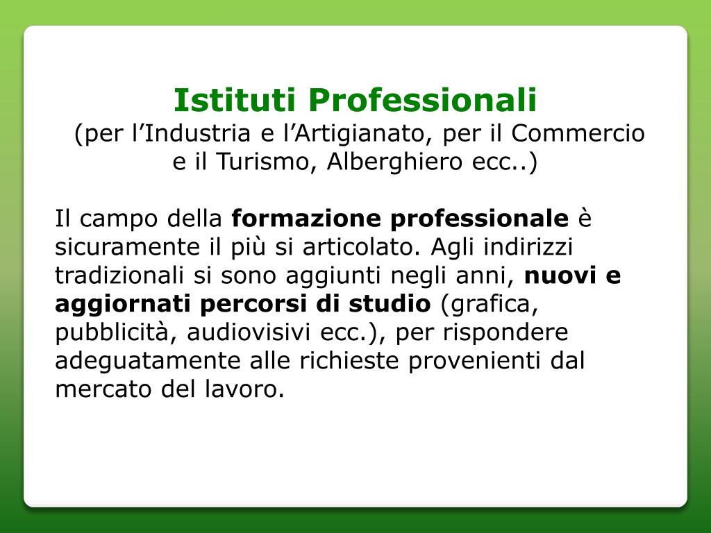 Istituti Professionali (per l’Industria e l’Artigianato, per il Commercio e il Turismo, Alberghiero ecc..) Il campo della formazione professionale è sicuramente il più si articolato. Agli indirizzi tradizionali si sono aggiunti negli anni, nuovi e aggiornati percorsi di studio (grafica, pubblicità, audiovisivi ecc.), per rispondere adeguatamente alle richieste provenienti dal mercato del lavoro.
