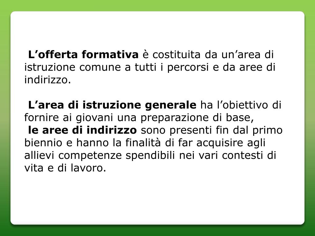 L’offerta formativa è costituita da un’area di istruzione comune a tutti i percorsi e da aree di indirizzo. L’area di istruzione generale ha l’obiettivo di fornire ai giovani una preparazione di base, le aree di indirizzo sono presenti fin dal primo biennio e hanno la finalità di far acquisire agli allievi competenze spendibili nei vari contesti di vita e di lavoro.