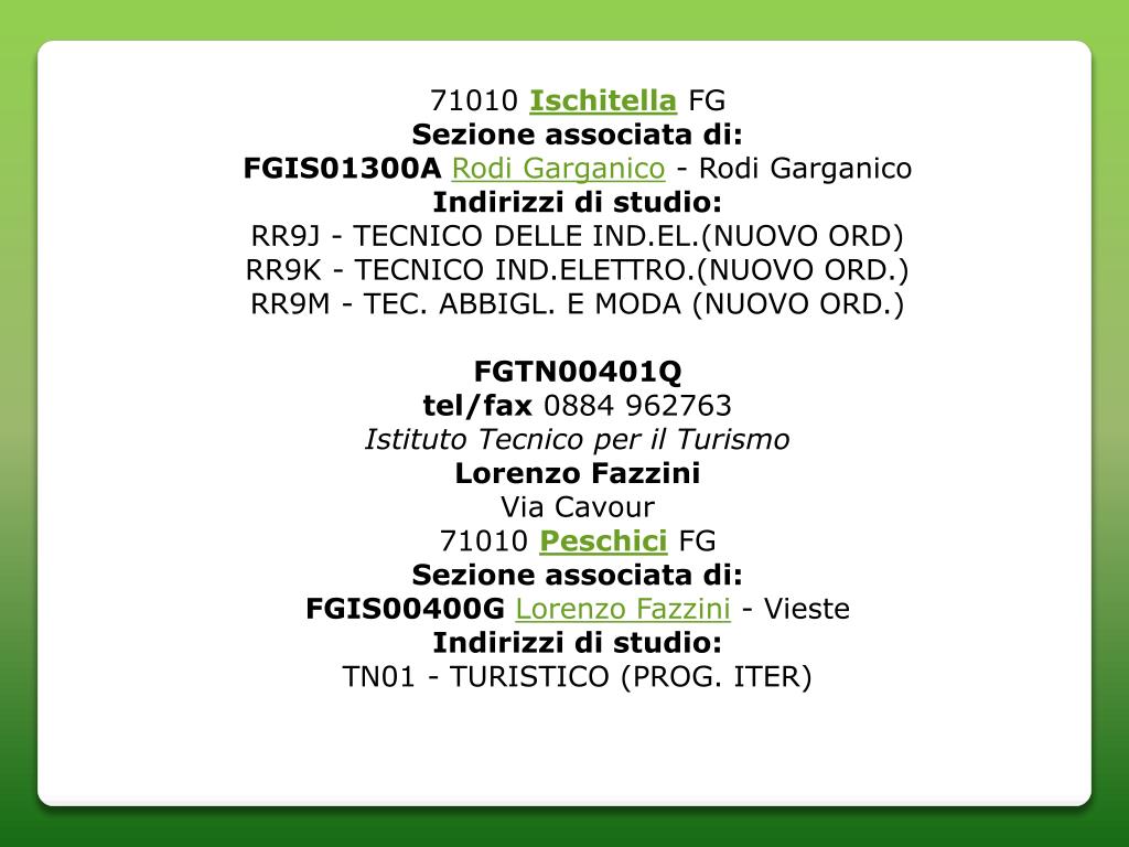 71010 Ischitella FG Sezione associata di: FGIS01300ARodi Garganico - Rodi Garganico Indirizzi di studio: RR9J - TECNICO DELLE IND.EL.(NUOVO ORD)RR9K - TECNICO IND.ELETTRO.(NUOVO ORD.)RR9M - TEC. ABBIGL. E MODA (NUOVO ORD.) FGTN00401Q tel/fax 0884 962763 Istituto Tecnico per il Turismo Lorenzo Fazzini Via Cavour71010 Peschici FG Sezione associata di: FGIS00400GLorenzo Fazzini - Vieste Indirizzi di studio: TN01 - TURISTICO (PROG. ITER)