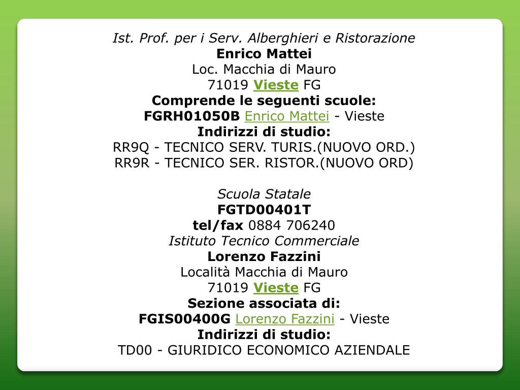 Ist. Prof. per i Serv. Alberghieri e Ristorazione Enrico Mattei Loc. Macchia di Mauro71019 Vieste FG Comprende le seguenti scuole: FGRH01050BEnrico Mattei - Vieste Indirizzi di studio: RR9Q - TECNICO SERV. TURIS.(NUOVO ORD.)RR9R - TECNICO SER. RISTOR.(NUOVO ORD) Scuola StataleFGTD00401T tel/fax 0884 706240 Istituto Tecnico Commerciale Lorenzo Fazzini Località Macchia di Mauro71019 Vieste FG Sezione associata di: FGIS00400GLorenzo Fazzini - Vieste Indirizzi di studio: TD00 - GIURIDICO ECONOMICO AZIENDALE
