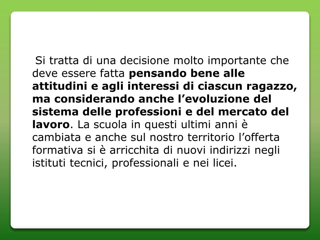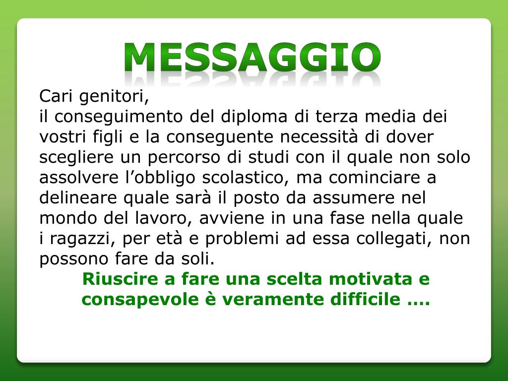 MESSAGGIO Cari genitori,il conseguimento del diploma di terza media dei vostri figli e la conseguente necessità di dover scegliere un percorso di studi con il quale non solo assolvere l’obbligo scolastico, ma cominciare a delineare quale sarà il posto da assumere nel mondo del lavoro, avviene in una fase nella quale i ragazzi, per età e problemi ad essa collegati, non possono fare da soli. Riuscire a fare una scelta motivata e consapevole è veramente difficile ….
