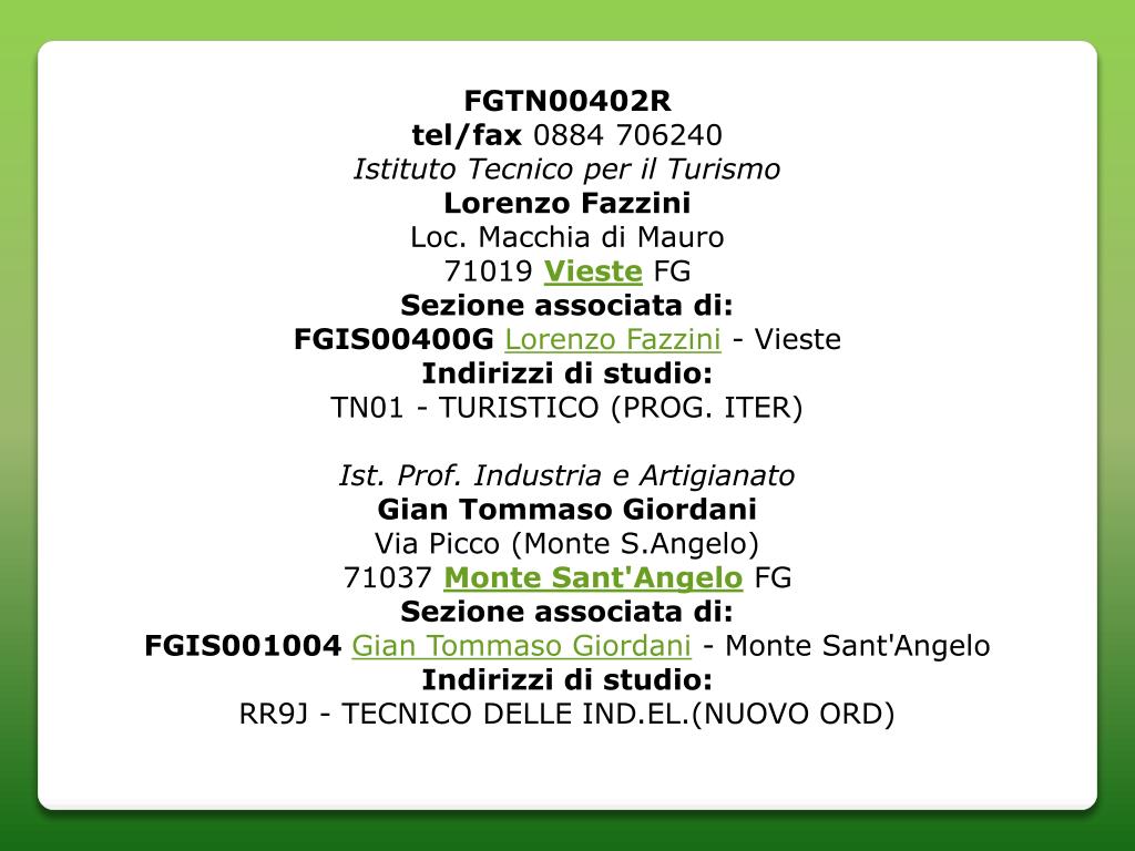 FGTN00402R tel/fax 0884 706240 Istituto Tecnico per il Turismo Lorenzo Fazzini Loc. Macchia di Mauro71019 Vieste FG Sezione associata di: FGIS00400GLorenzo Fazzini - Vieste Indirizzi di studio: TN01 - TURISTICO (PROG. ITER) Ist. Prof. Industria e Artigianato Gian Tommaso Giordani Via Picco (Monte S.Angelo)71037 Monte Sant'Angelo FG Sezione associata di: FGIS001004Gian Tommaso Giordani - Monte Sant'Angelo Indirizzi di studio: RR9J - TECNICO DELLE IND.EL.(NUOVO ORD)