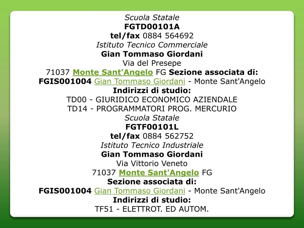 Scuola StataleFGTD00101A tel/fax 0884 564692 Istituto Tecnico Commerciale Gian Tommaso Giordani Via del Presepe71037 Monte Sant'Angelo FG Sezione associata di: FGIS001004Gian Tommaso Giordani - Monte Sant'Angelo Indirizzi di studio: TD00 - GIURIDICO ECONOMICO AZIENDALETD14 - PROGRAMMATORI PROG. MERCURIO Scuola StataleFGTF00101L tel/fax 0884 562752 Istituto Tecnico Industriale Gian Tommaso Giordani Via Vittorio Veneto71037 Monte Sant'Angelo FG Sezione associata di: FGIS001004Gian Tommaso Giordani - Monte Sant'Angelo Indirizzi di studio: TF51 - ELETTROT. ED AUTOM.